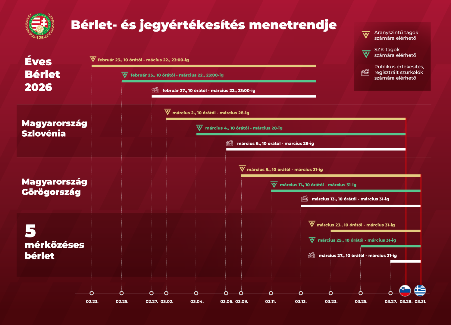 A Szlovénia ellen mérkőzés belépői mellett március 9-én indul a jegyértékesítés a Görögország elleni (március 31., kedd, 19:00) találkozóra is.