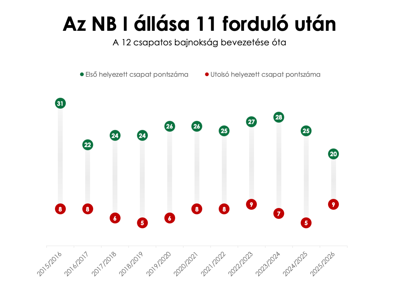 A szerzett pontokat nézve az első kör után ilyen alacsony különbség a listavezető és a sereghajtó között a 12 csapatos bajnokság bevezetése (2015/2016-os szezon) óta egyszer sem fordult még elő.