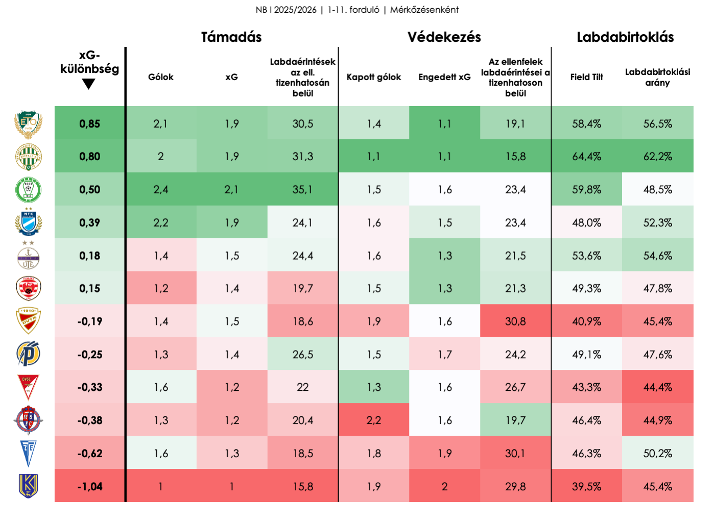 Ezek alapján a fent említett csapatokat az úgynevezett „felülteljesítők” csoportjába sorolhatjuk, ugyanis mind előrébb áll a tabellán, mint az xG-különbség szerinti rangsorban, ami azt méri, hogy egy csapat mennyivel képes nagyobb minőségű helyzeteket kidolgozni, mint az ellenfelei. „Alulteljesítő” csapatokat is felfedezhetünk, a Győr és a Ferencváros annak ellenére nem férnek fel a dobogóra, hogy ők játszottak a legnagyobb fölényben az eddigi mérkőzéseiken, ám egyelőre ez az eredményeikben nem tükröződik vissza.