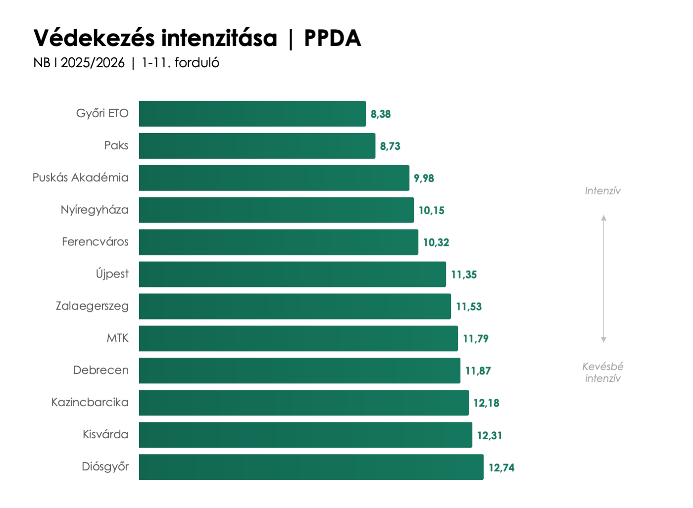 A védekezés intenzitását tekintve a Győr emelkedik ki a mezőnyből, ők az a csapat, amely átlagosan a legkevesebb passzt engedi az ellenfeleinek, mielőtt egy védekező akcióval közbe lépne a játékba, de a Paks is hű maradt a gyors visszatámadásra építő védekezési stílusához. A skála másik végén a Diósgyőr található, az ő játékukra inkább a mélyebb és kevésbé intenzív védekezés jellemző.