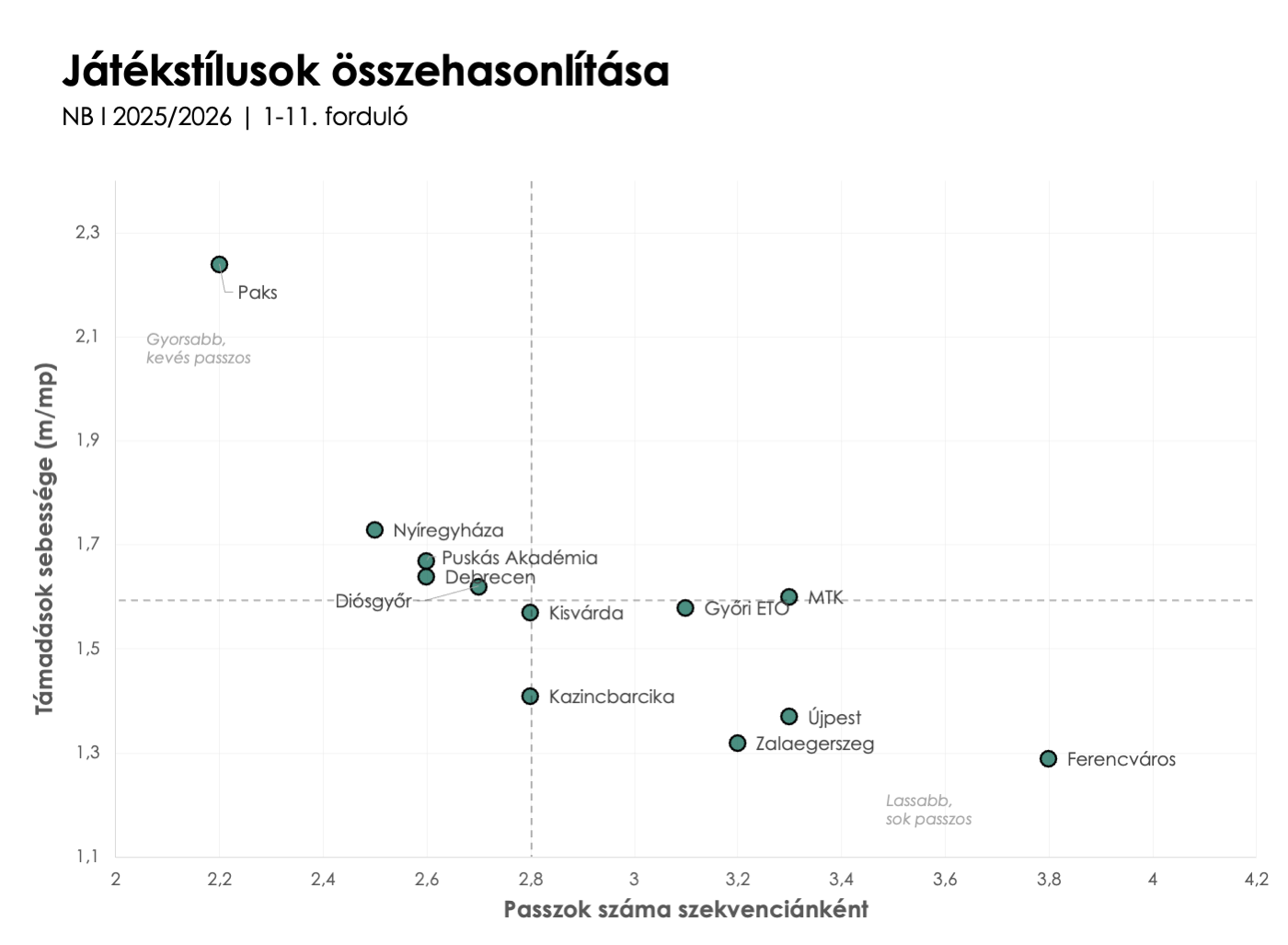 11 forduló elteltével már körvonalazódni látszik, hogy a csapatok milyen játékstílust követve próbálnak érvényesülni a pályán. Ebben az összevetésben kevesebb a meglepetés, a legdirektebb futballt évek óta a Paks játssza Magyarországon, és az sem újdonság, hogy a Ferencváros a leginkább labdadomináns csapat.