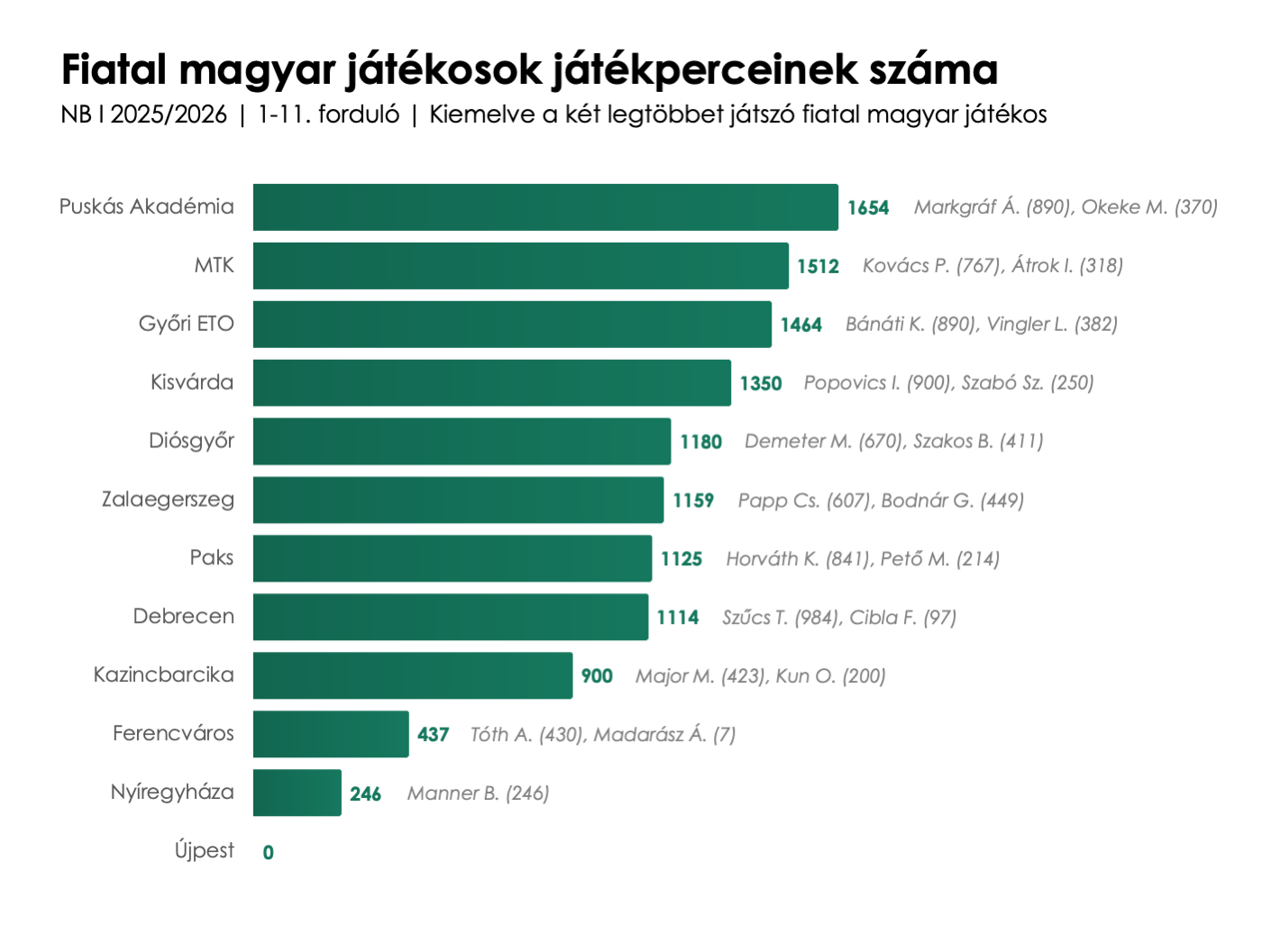 A bajnokság első körének pozitív fejleménye, hogy több fiatal magyar labdarúgó is meghatározó játékosnak számít csapatában. Közülük az U21-es válogatottban és a Debrecenben is alapembernek számító Szűcs Tamás nevéhez fűződik a legtöbb játékperc (984). A támogatott korosztály tagjai összesen 12 141 percet töltöttek eddig a pályán, a legtöbb lehetőséget a Puskás Akadémia, az MTK és a Győr biztosította számukra.
