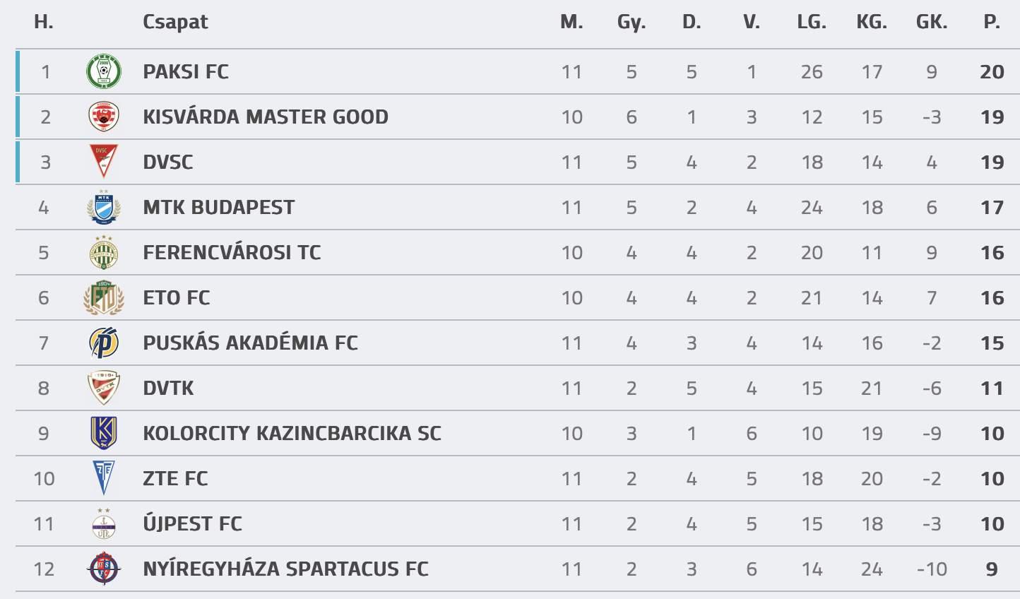 Ha rátekintünk a tabellára, rögtön feltűnik, mennyire szoros a most zajló bajnokság. Az első helyezett Paks és az utolsó pozíciót elfoglaló Nyíregyháza mindössze 11 pontos távolságra vannak egymástól.
